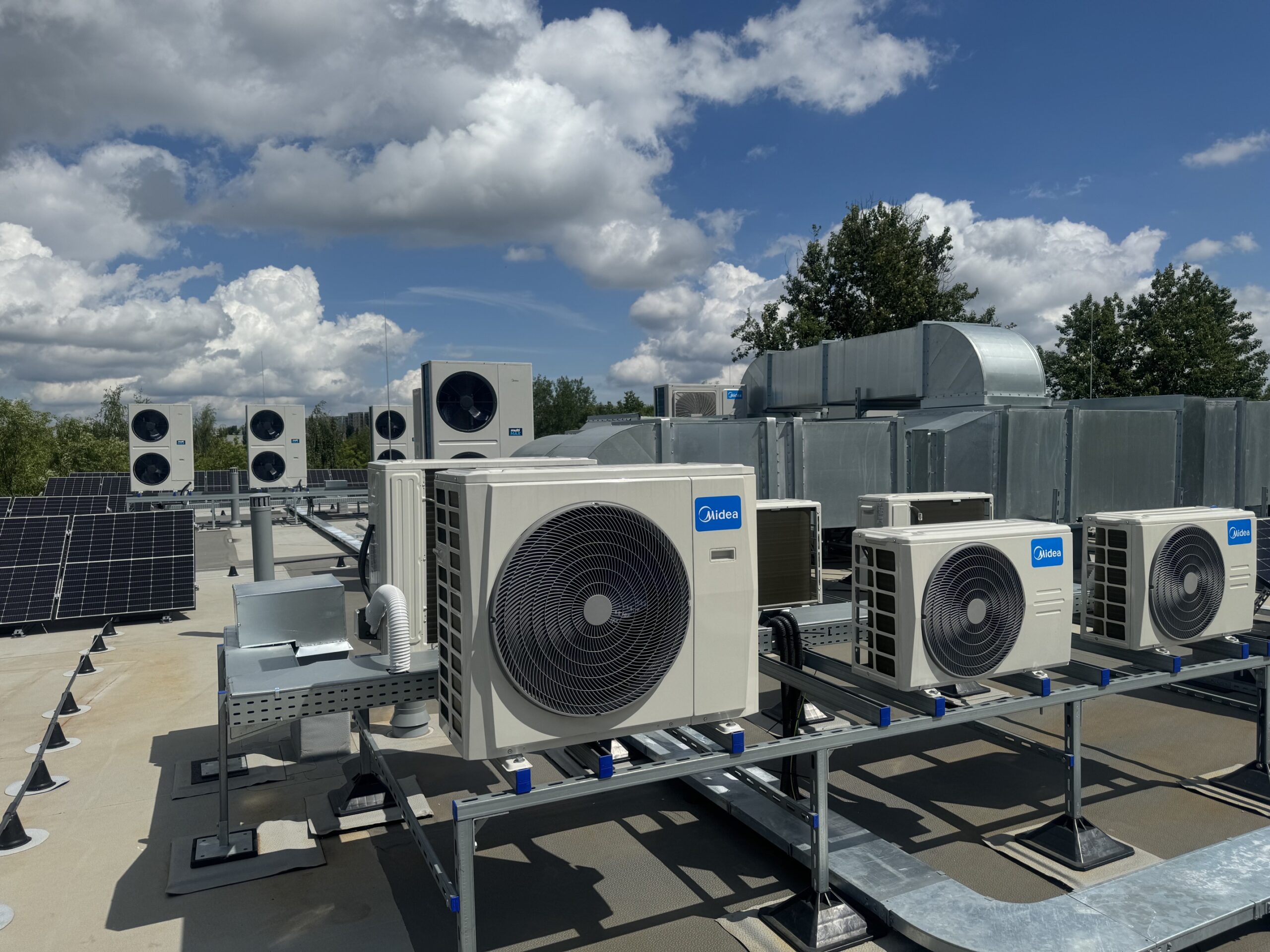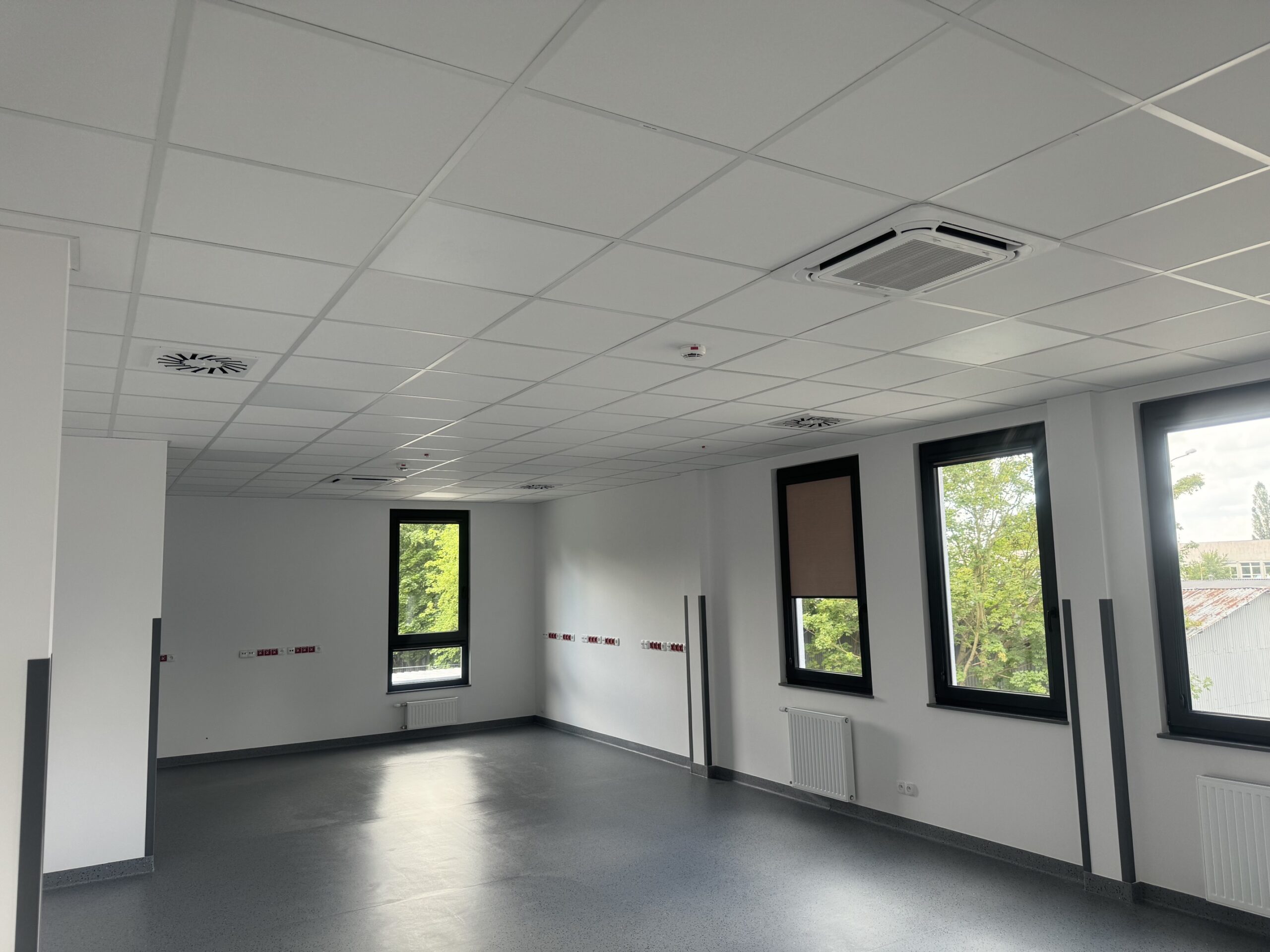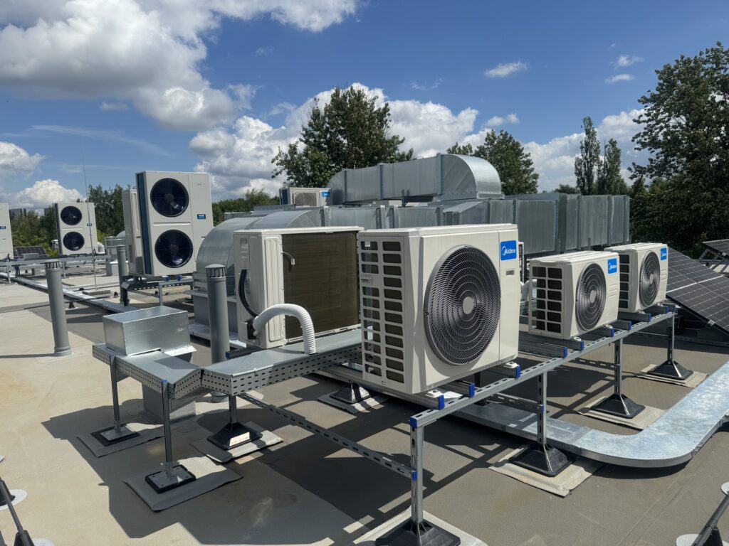 Trzykondygnacyjny budynek użyteczności publicznej, 118 urządzeń ściennych i kasetonowych w układzie VRF, a także klimatyzacja precyzyjna pomieszczeń technicznych.